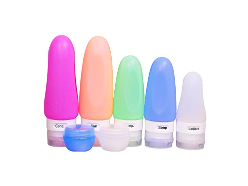 This set of 5 silicone bottles and two small cream jars are perfect for shampoo, conditioner, body wash, lotion, face wash, sunblock and more! They are 100% BPA Free Food Grade Silicone and have been created not to leak. Each bottle has a rotatable ID Window so you can change the text to know exactly which is in what bottle.